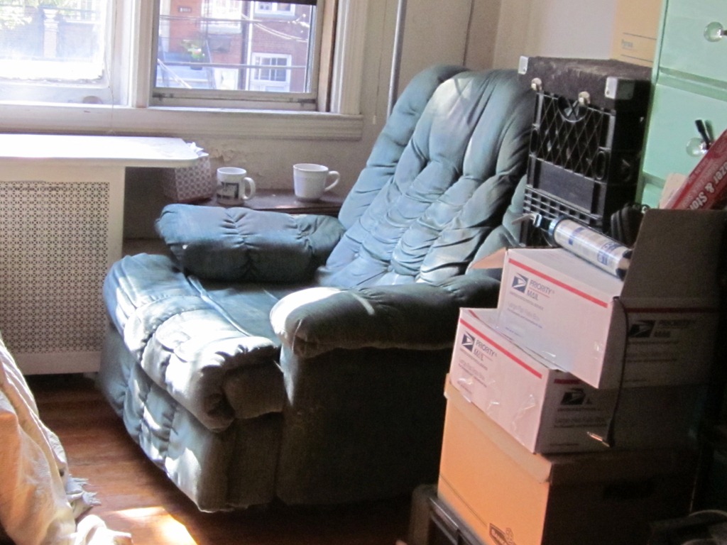 Part of the problem is that I really can’t see, from the photo I’m working from, the corner of the chair. You see, my boyfriend is a former DJ, and a packrat. In the photo I took, there are piled boxes of electronic equipment.