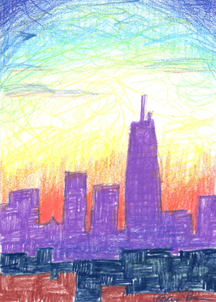 Here I am featuring the lower Manhattan skyline as it is, now. The tall building is the Freedom Tower, the new World Trade Center. I also played a lot with types of pencil strokes…scribbles, parallel lines, and more in order to create a more atmospheric effect.