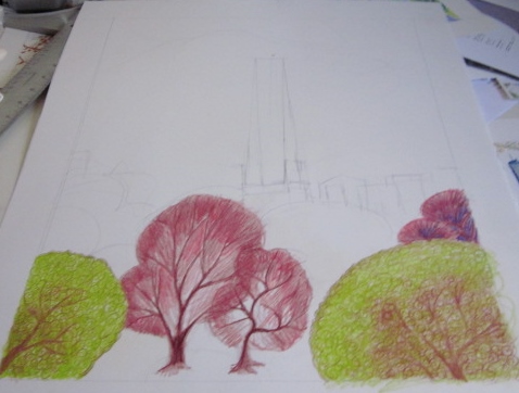 Here’s the stage where I am in doing the large version of “Freedom Tower”. As I usually find, when you translate something small into something much larger, you run into difficulties in detail and composition. Here I’m finding I need more trees to fill up the foreground.