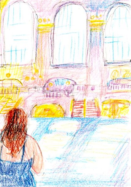 I’ve worked on the 5×7 sketch. I decided to keep the woman in the same proportion as she is in the photo….without doing that, the drawing had no strong focal point. I also plan to keep it low-key and watercolor-like, since in the morning, the Main Concourse is bathed in light. Here’s the sketch.