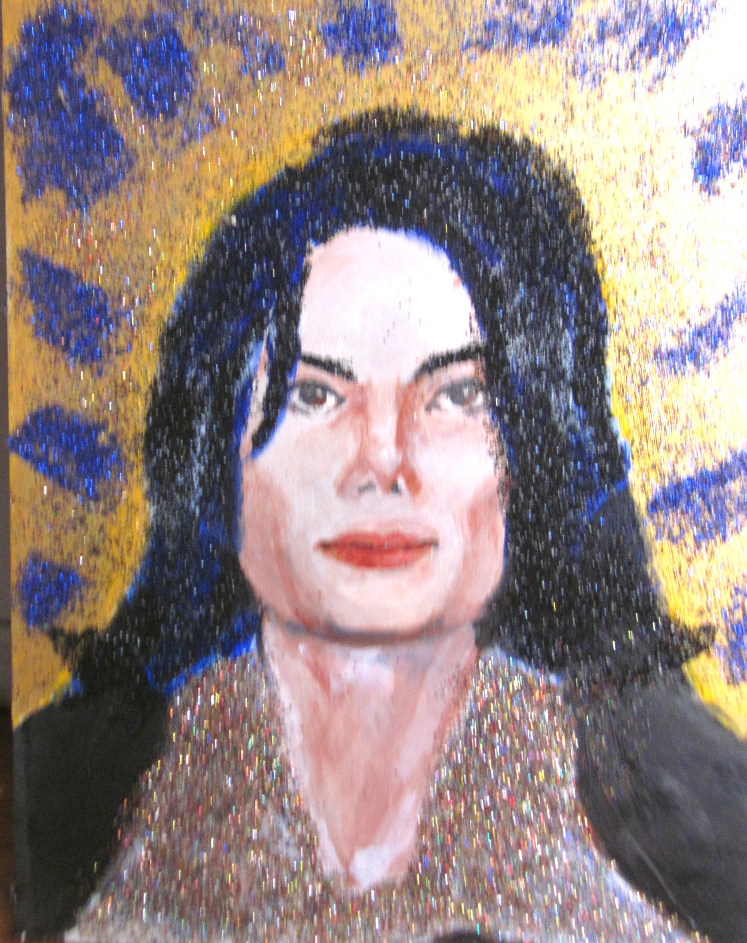As for what I’m doing now….just for fun, I’m doing glittery, rhinestoney, Pop Art portraits of celebrities. Well, in all honesty, I’ve just done one so far: Michael Jackson.
