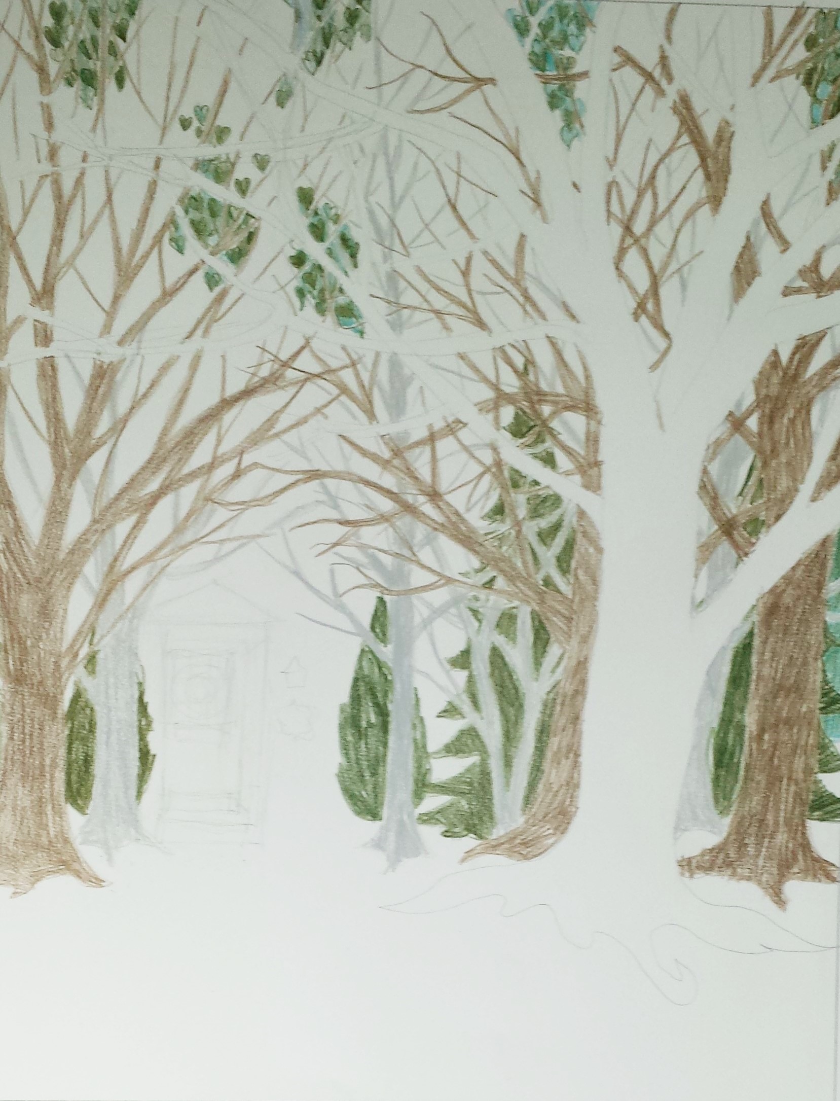 As for the beginning of another paradise series? Here’s the work in progress for the winter themed artwork I am doing, with the intention of maybe making a holiday card out of it next year. But, as I draw it, I see little glimpses of a utopia in the composition. And so, it grows.