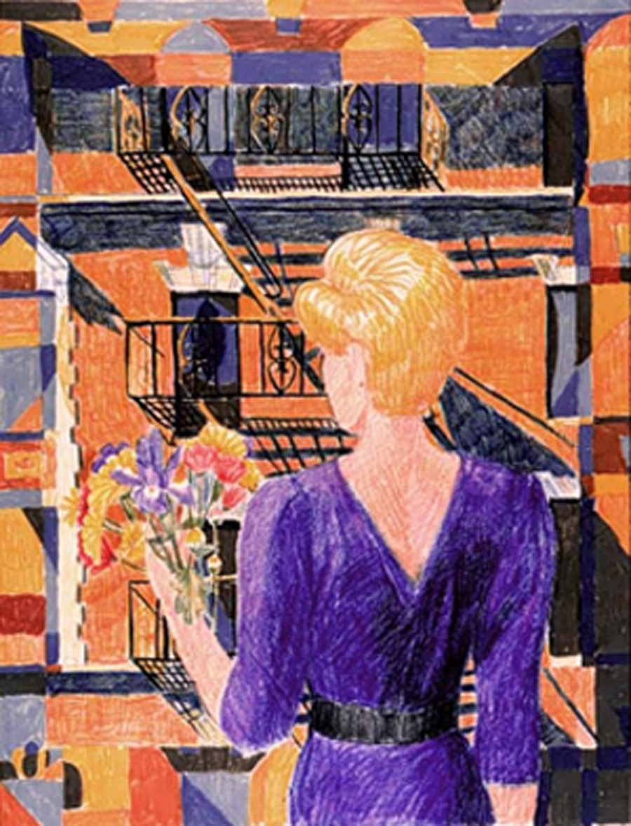 Yes, it’s a very abstract cat. I wanted to put a cat in a window in this, but decided it would take away from the subject matter of the woman holding flowers. So, I hid it.