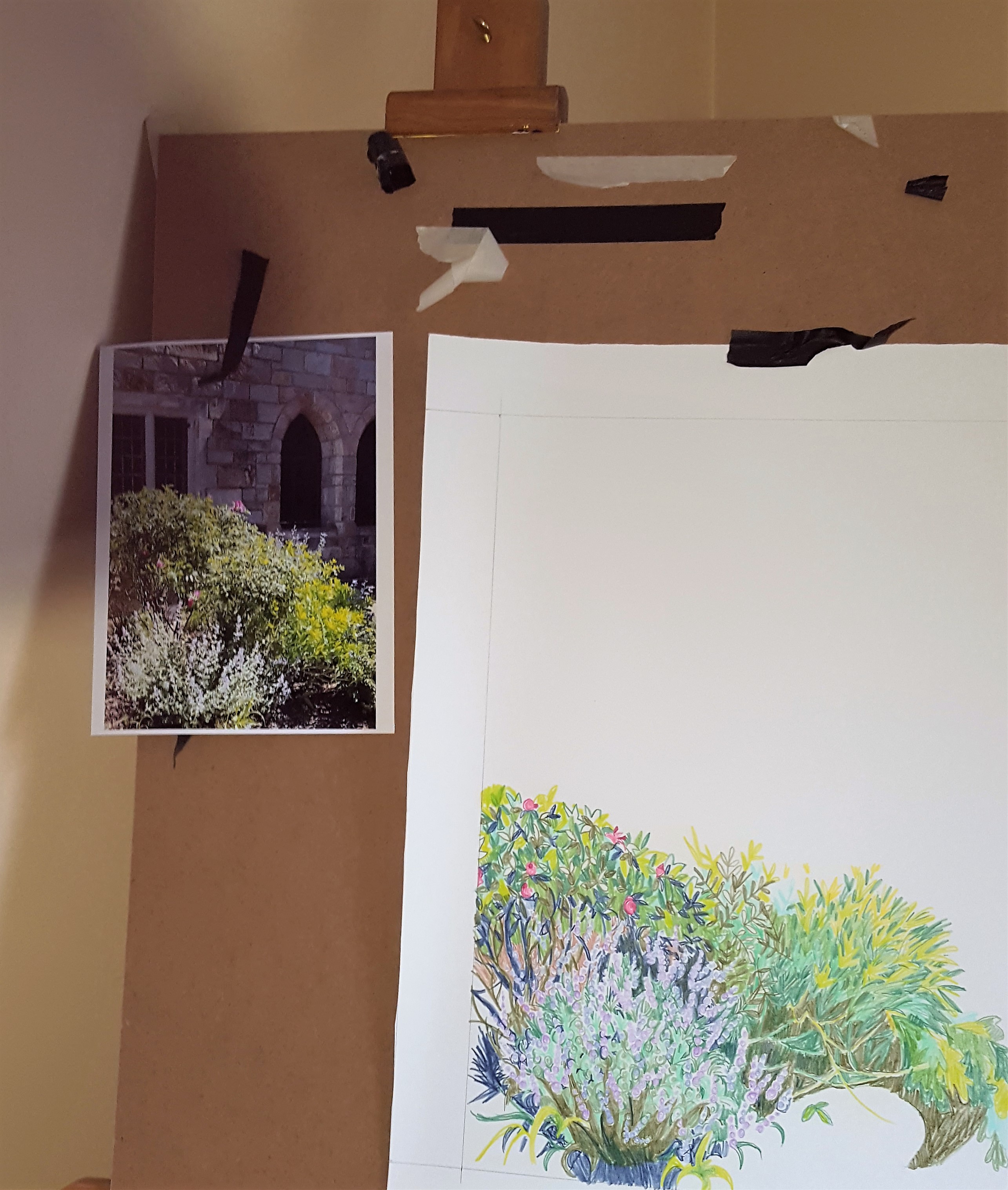 The mistake is in proportions. As you can see by the photo I’m using, the shrubs come to over half the height of the drawing…more like three quarters. That is considered an ideal ratio. However, not thinking, I divided it in half. Bad, bad, bad. Breaks one of the common rules of proportion. Of course, people say rules are made to be broken, but most of the time, they’re not to be broken. The rules are there for a reason. Anyway, I’ll either have to start over, or compensate in some way. Compensating is ideal, and I do have an idea….