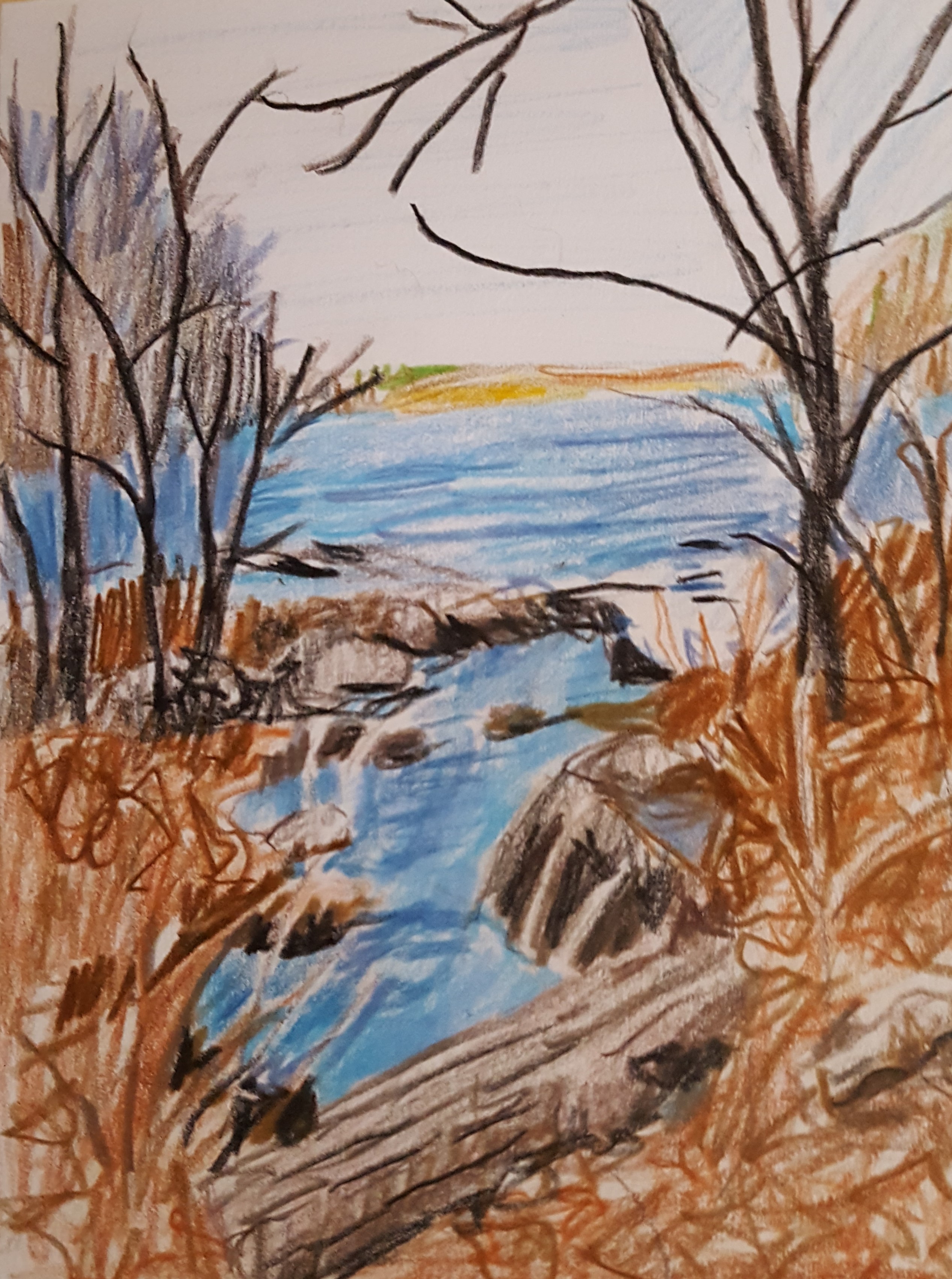 Last winter, I went for a walk with some friends in a bit of a wilderness area. Took a picture of what I thought would make a good drawing. Looking at it again, I decided it would make a good piece of artwork..that is, if you’re Bob Ross. Not to undermine anyone’s admiration of the man, he was a good soul, however, I’m not a big fan of his work.