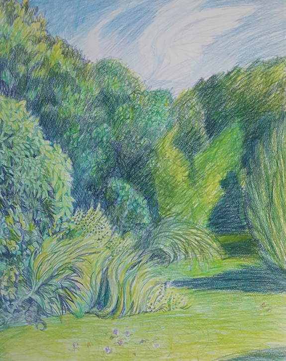 I’m going to have to take a break from artwork for a while. I have ideas, but all of them contain lots and lots of foliage. You know what? I’m sick to death of drawing lots and lots of foliage, and I’ve also about run out of green pencils. So, until I either come up with different ideas, or feel like drawing foliage again, I’m going to be on vacation. So, here’s a blast from last year, and I bid you au revior.
