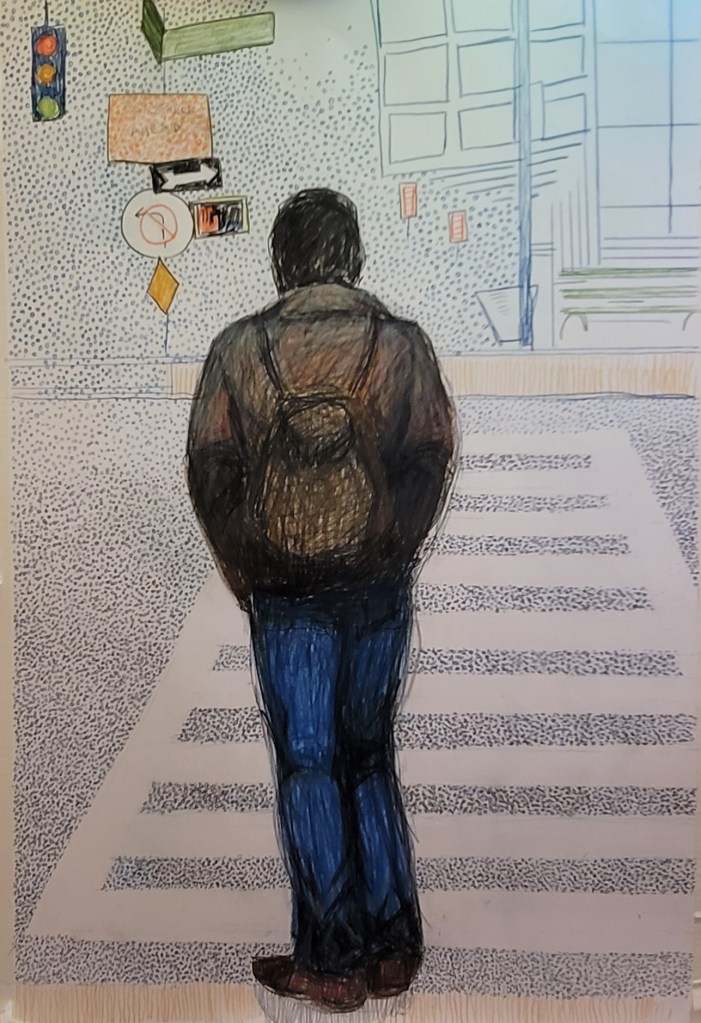 In any city, be it Manhattan or Danbury, you only pay attention to the big pertinent things as you go to get someplace. Sign, lights, things in the way, things that you might trip on. The drawing has a truth to it that I didn’t expect.