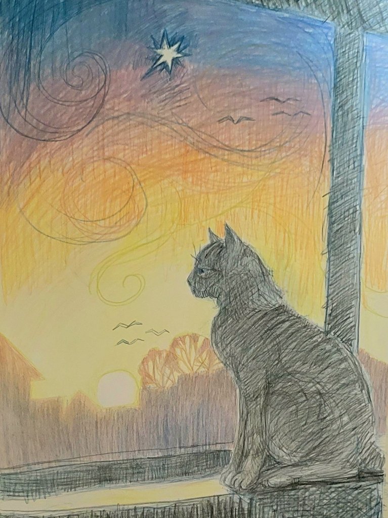 I realize that I only partially finished the drawing of the cat looking out the window at the sunrise. I worked some more on it, and the finished version is posted above.