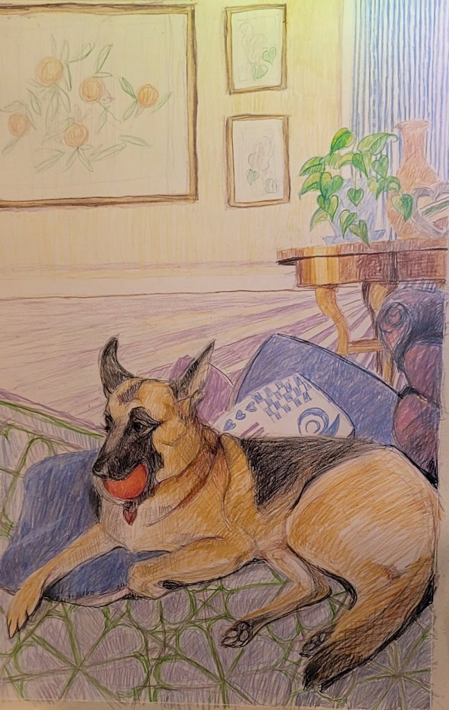 So, as you can see, I finished the drawing of my friend’s German Shepherd. Not totally thrilled with it. Instead of the background being mostly blank except a few framed picture, I wish I had put in more items that belong to the dog’s Mama. Oh well, it’s done and so it is.