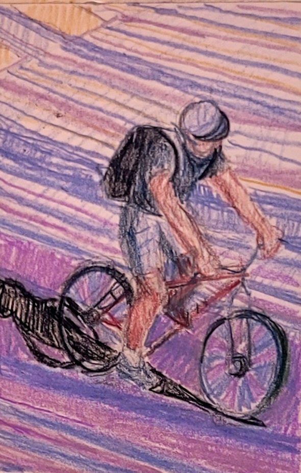 So, I’m working on the full size drawing. It has a more complicated composition. As my philosophy is “Go with what you know “, I’m starting with the bicycle. Drawing a figure riding a bike isn’t easy, so I have pencil marks and eraser schmears in a big mess.