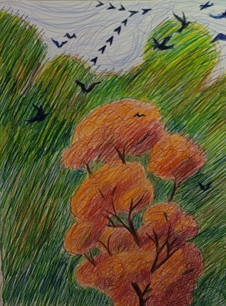 Well, I didn’t like it…kind of boooooring, with no trace of man or other fauna. So, I decided, since it’s an autumn drawing to put in some birds flying south.I didn’t like this either, the composition with the birds just looked wrong. So, I went into manic series of works in progress.