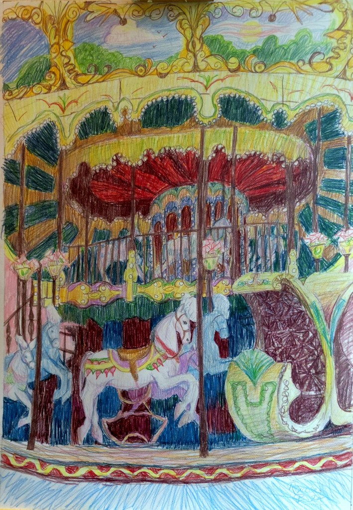 As for the carousel, I work there. It’s my day job now. The carousel is indoors at the local mall, in the food court. So, when I’m not busy, I watch people who walk by with their bags from Chick-Fil-A, and I get hungry. That’s the worst part of the job.