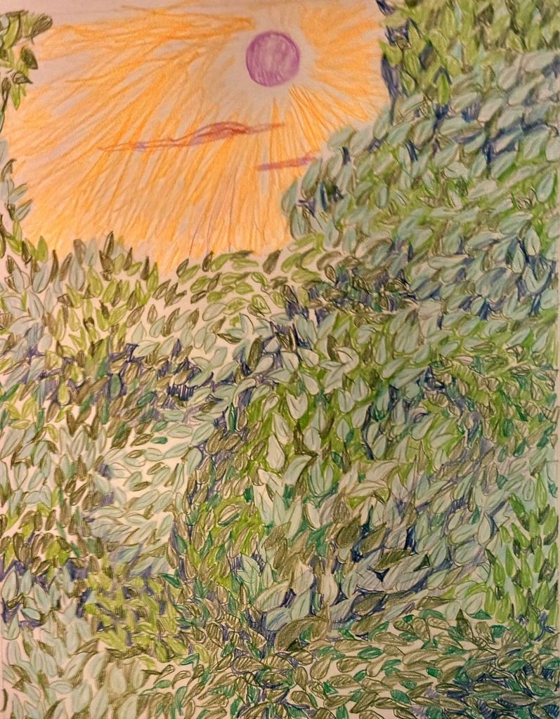 So, a snippet of a day in my life, here goes. I just was puttering around, got hungry, and opened up a can of soup. Vegetable soup. I’m a little crazy, I know that, but I realized that the color of the soup was the same color scheme as the drawing I just completed. Talk about a one track mind.