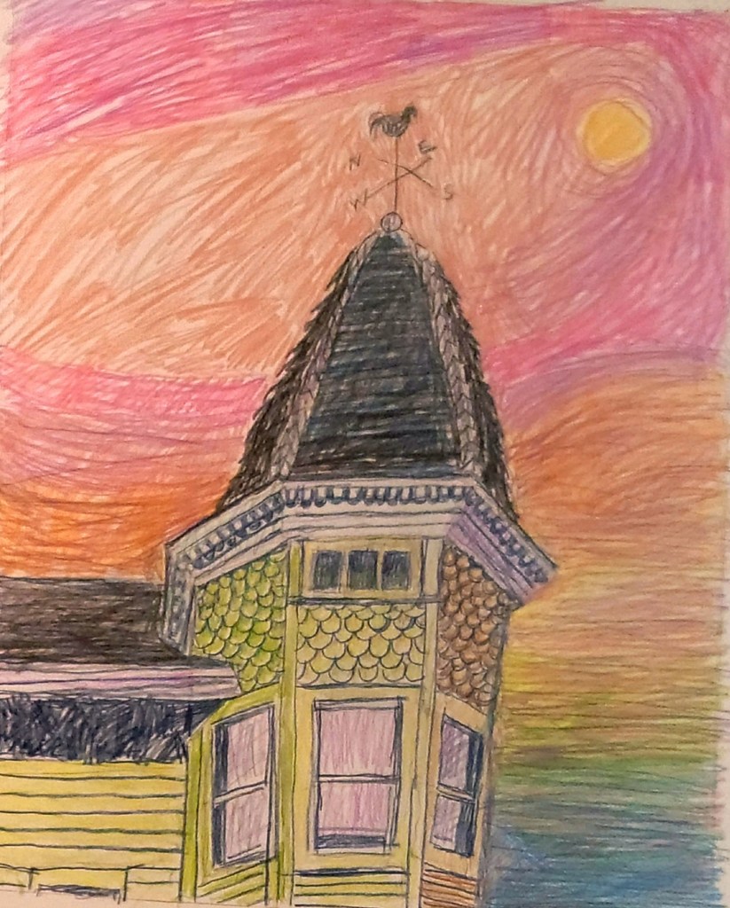 So, at a loss for what to draw, I went once again to my handy dandy idea generator, namely my phone. What I came across is this, and elaborated on it. The picture is of a coffee shop in a nearby town.