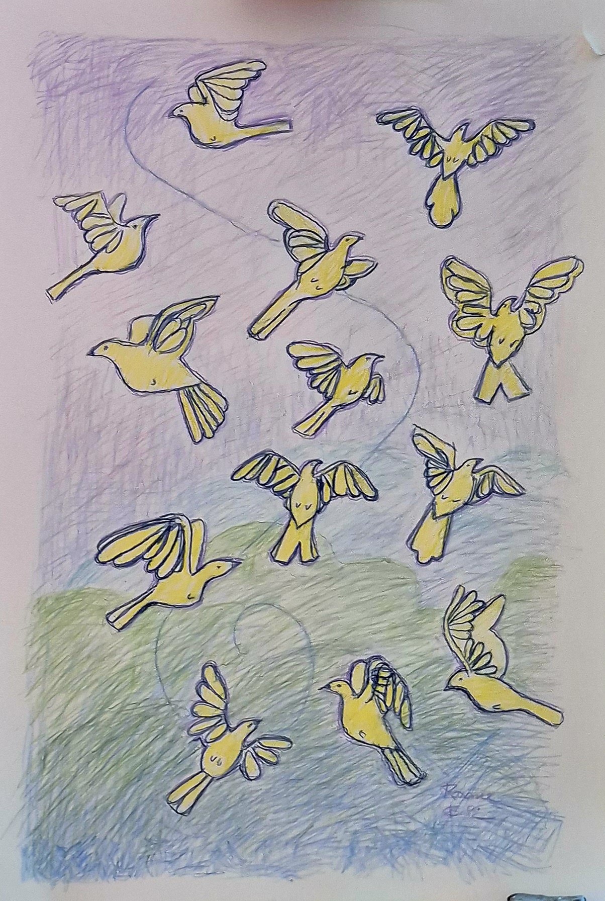 In what feels like another life, here in Connecticut, I walked past a derelict house. The yard had grown weeds. In the weeds, though, was a lot of yellow birds, feeding. I never saw them take off. So, my memory of yellow birds gave me the urge to draw them in flight.