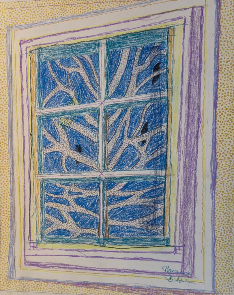 So, having nothing better to do, I decided to draw the tree and the window. Honestly, I meant it to be more realistic, but as I said, I didn’t know where to draw the lines. So, I decided to make a design of the lines surrounding the window opening. So, it ended up being more abstract than I intended. I also realize that this is the direction my art is taking me. I’m doing patterned representational work.