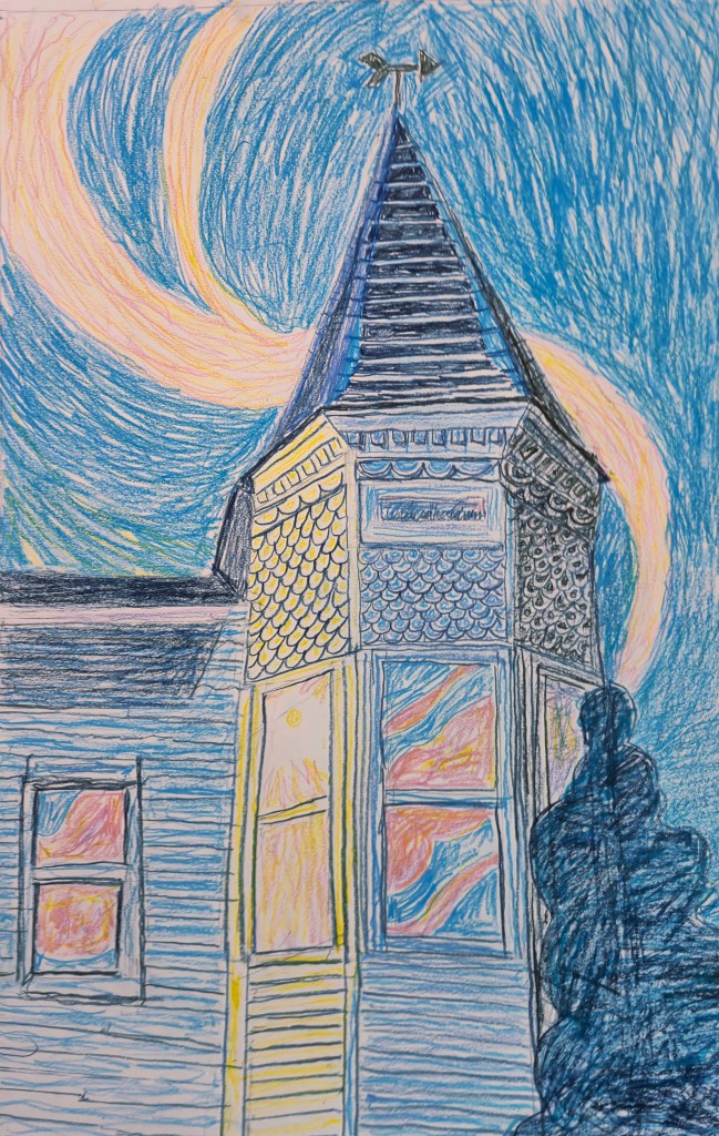 For a while now, I’ve been fascinated by reflections on windows. As for “at dusk”, I chose that because it comes full circle of a drawing I did a long time ago, titled “House at Sunrise.