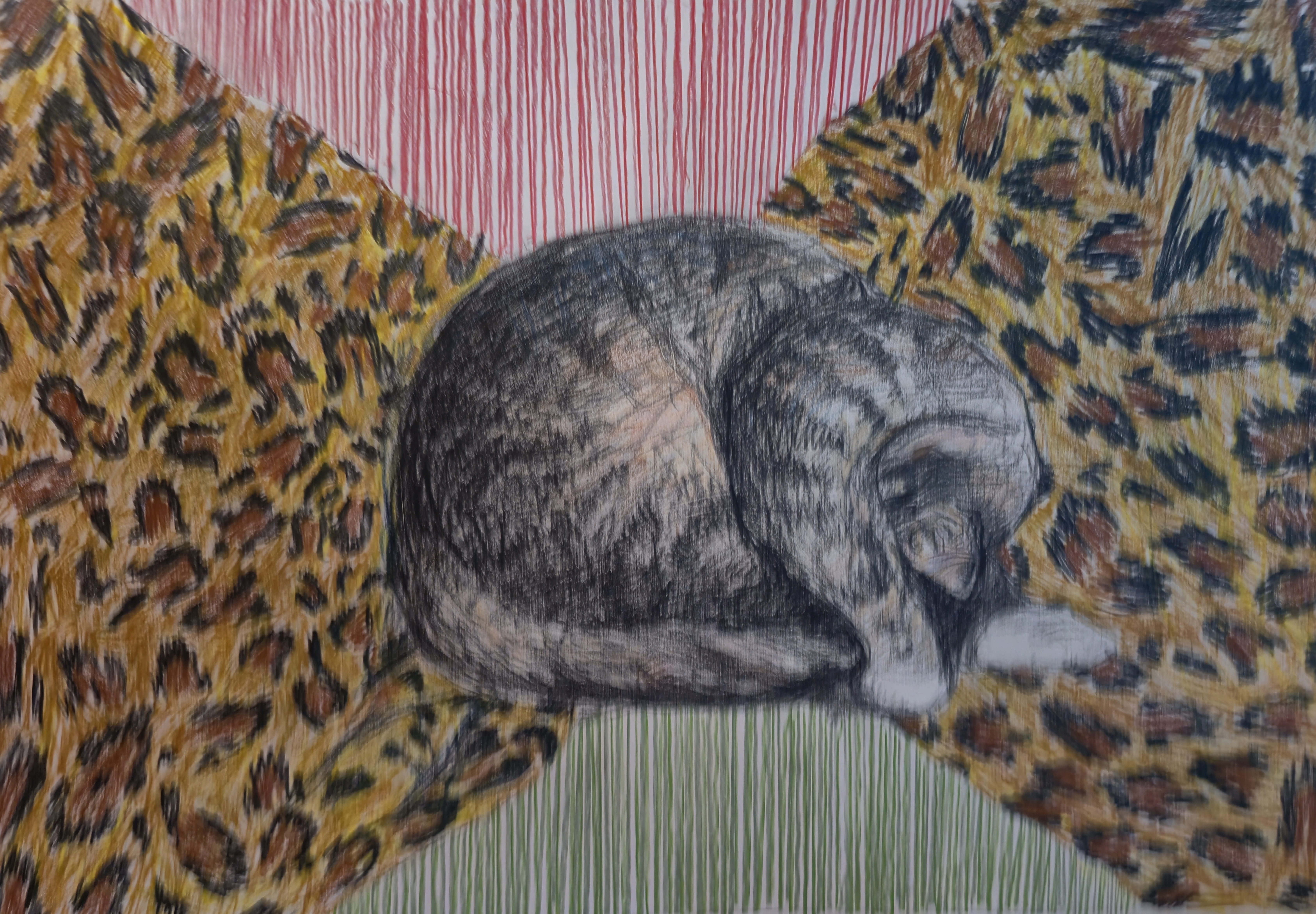 Everyone who knows me, knows I’m a cat lover. I also am drawn to contrasting patterns in my artwork. So, my tiger cat, Venus, decided to take a nap on my leopard patterned robe. So, for better or worse, this is: