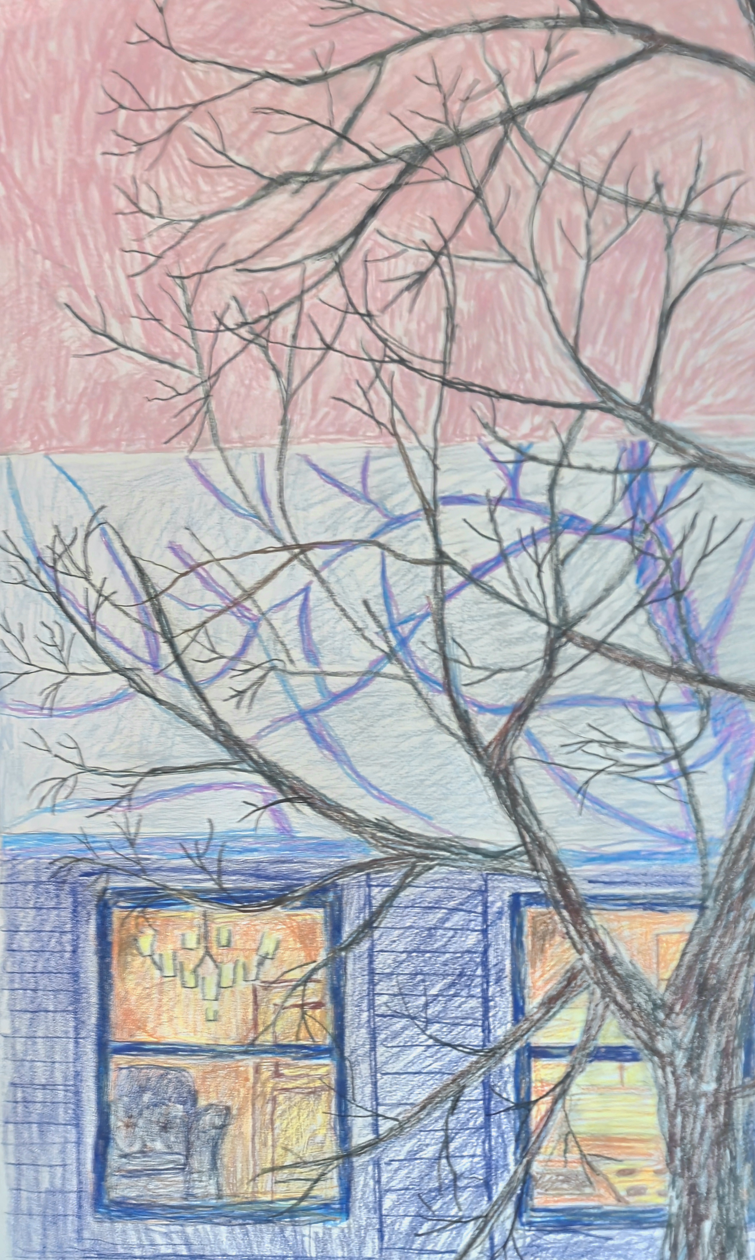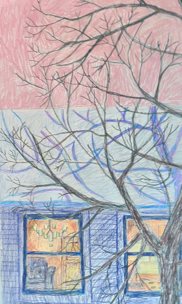 We’ve been having a pretty snowy winter here in Connecticut, which is why my drawings have featured snow. So, here’s another. This is a view outside my living room window across the to the other side of the condominiums. You can see just how little privacy we gave. No complaints otherwise, it’s home.